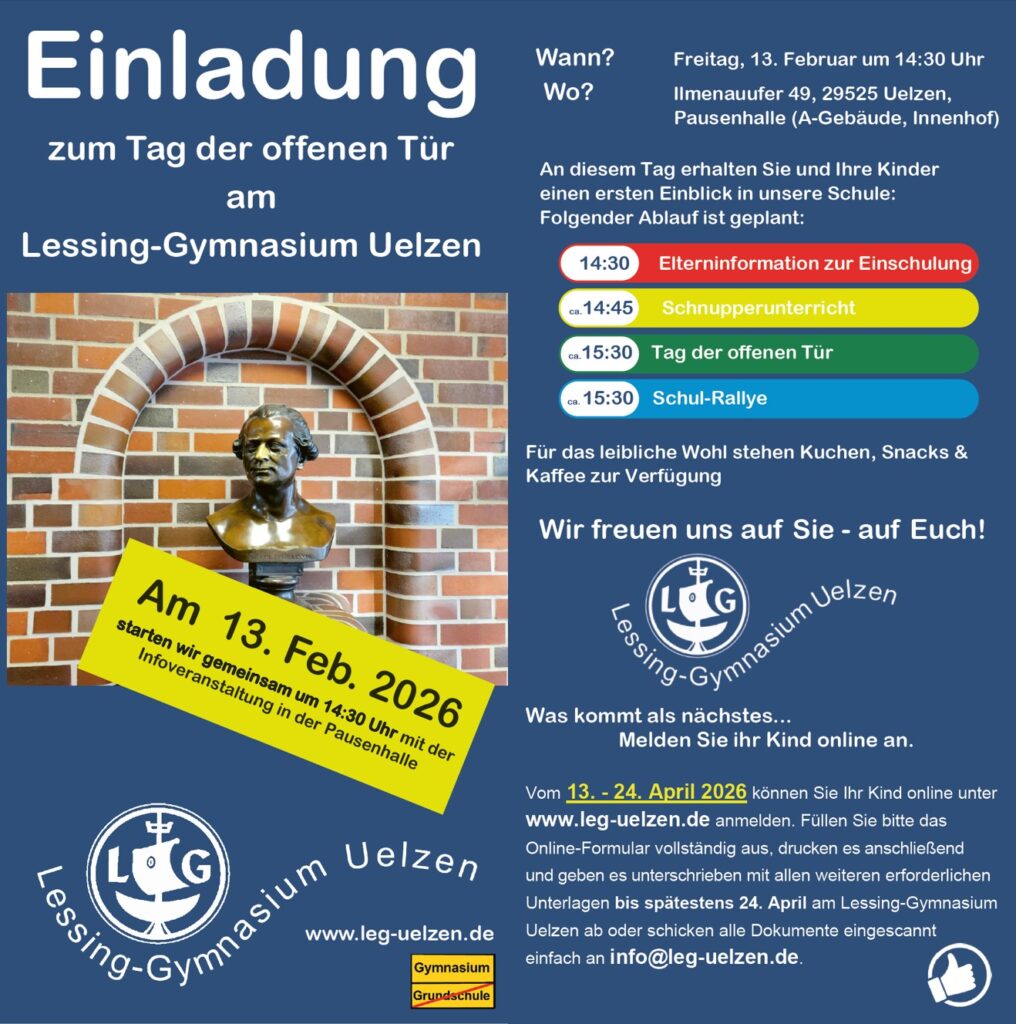 Schicken Sie den Kontrollausdruck der Online-Schulanmeldung und die Formulare zur Schulanmeldung vollständig ausgefüllt und unterschrieben als PDF-Dokumente per Email an info@leg-uelzen.de .